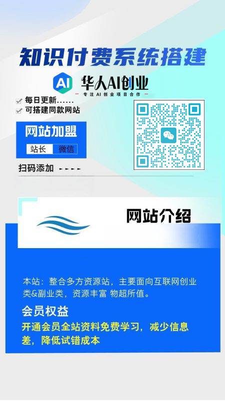 加盟华人AI创业,加盟搭建同款知识付费资源网站,实现长期稳定被动收入~